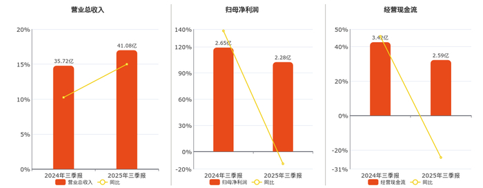 公司营业总收入为41.08亿元,在已披露的同业公司中排名第10,较去年同报告期营业总收入增加5.36亿元,实现3年连续上涨,同比较去年同期上涨15.00%。归母净利润为2.28亿元,在已披露的同业公司中排名第13,较去年同报告期归母净利润减少3702.37万元,同比较去年同期下降13.95%。经营活动现金净流入为2.59亿元,在已披露的同业公司中排名第16,较去年同报告期经营活动现金净流入减少8313.41万元,同比较去年同期下降24.31%。