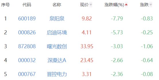 泉阳泉、启迪环境、曙光数创、深桑达A、晋控电力位列涨幅榜后五位,涨幅分别为-7.79%、-5.73%、-3.03%、-2.66%、-2.36%。