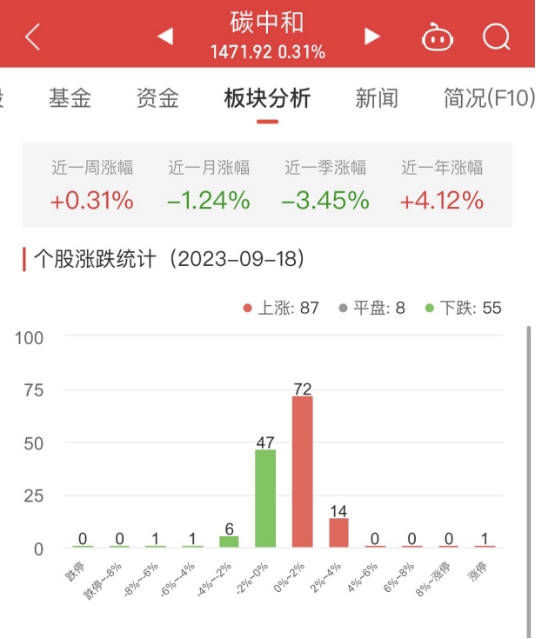 中国经济网北京9月18日讯今日,碳中和板块整体涨幅0.31%,其中87只股票上涨,8只股票平盘,55只股票下跌。