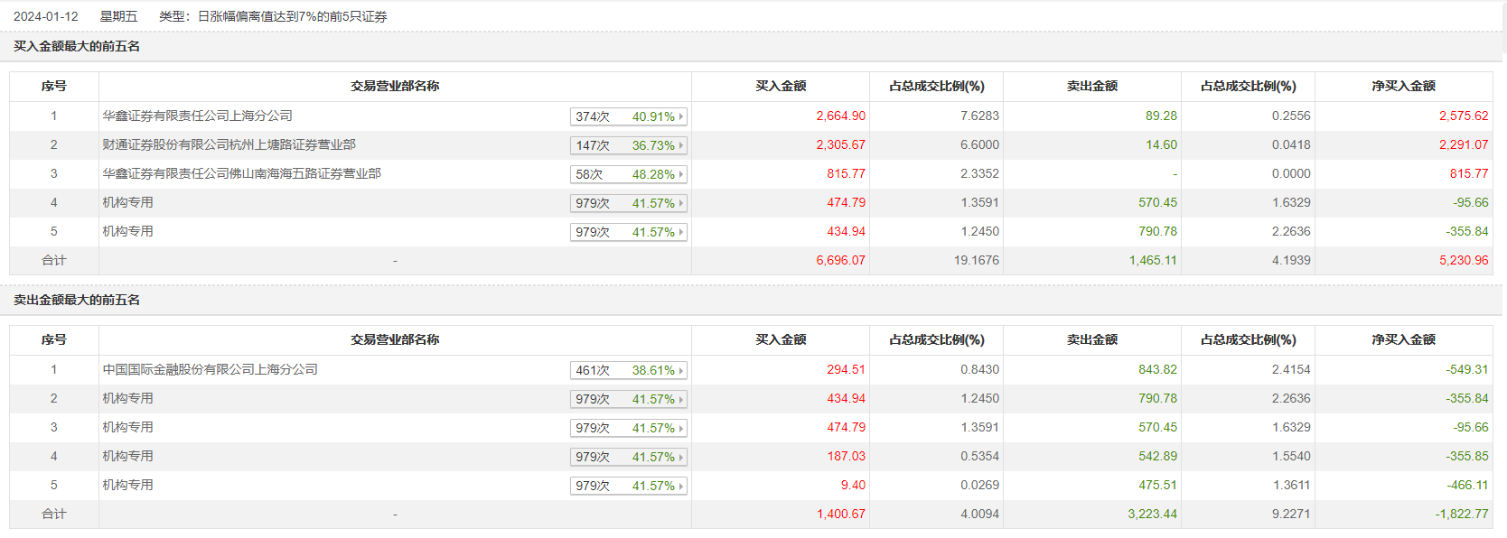 1月12日,万方发展今日涨停,全天换手率达15.77%,振幅达13.02%。龙虎榜数据显示,营业部席位合计净买入3859.69万元。其中,机构买入1106.16万元,卖出2379.62万元,合计净卖出1273.46万元。此外,华鑫证券上海分公司、财通证券杭州上塘路证券营业部分别买入2664.90万元、2305.67万元;中国国际金融上海分公司、华鑫证券上海分公司分别卖出843.82万元、89.28万元。
