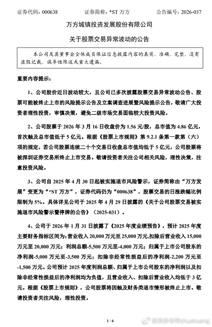 3 月 16 日晚间,深交所主板上市公司 * ST 万方(000638.SZ)发布《关于公司股票可能因市值终止上市的首次风险提示公告》,一纸公告将这家上市近 30 年的老牌企业,彻底推到了退市悬崖边。投资参考网记者梳理公告内容确认,截至 3 月 16 日收盘,公司股票收盘价报 1.56 元 / 股,对应总市值仅4.86 亿元,首次触及深交所 “连续 20 个交易日总市值低于 5 亿元将终止上市” 的红线,退市警报正式拉响。