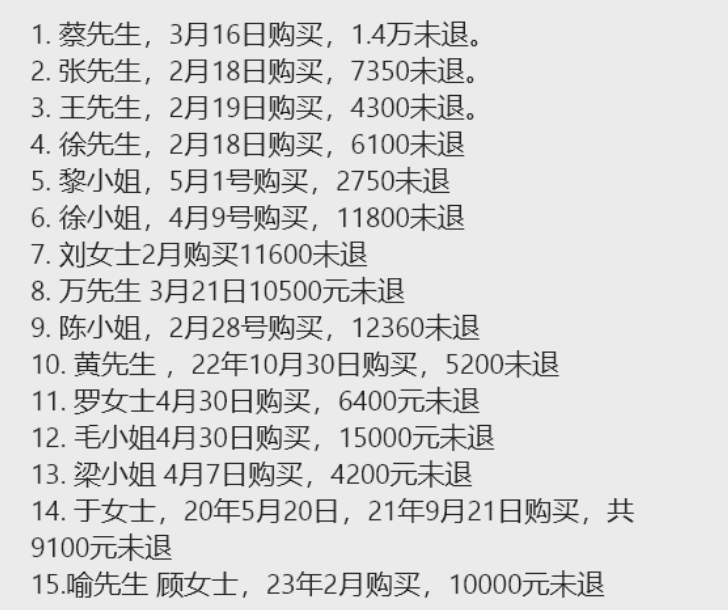 与梁芳情况类似的消费者不在少数。根据记者收集的案例,他们购买空调后同样被该门店拖延发货,理由包括了周末仓库放假、仓库没货、多雨天气送货打湿空调等。只有极个别消费者收到部分货物。被拖欠时间最长的超过3年。每个案例牵涉的金额从3000多元到3万多元不等。