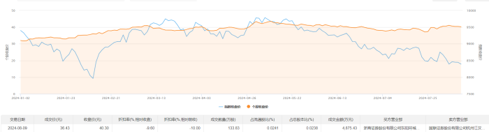 8月9日大宗交易成交133.83万股,成交额4875.43万元,占当日总成交额的5.98%,成交价36.43元,较市场收盘价40.3元折价9.6%。