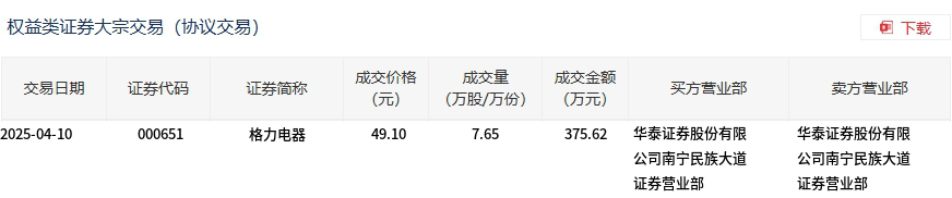 格力电器今日大宗交易溢价成交7.65万股,成交额375.62万元
