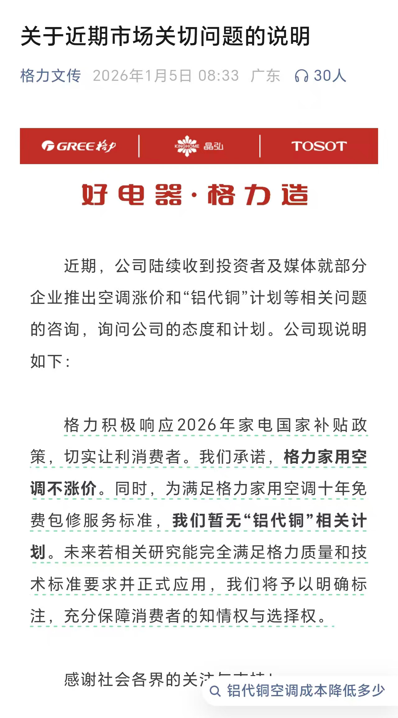 1月5日,格力电器通过公司文化传媒中心官方公众号“格力文传”发文称,近期陆续收到就部分企业推出空调涨价和“铝代铜”计划等相关问题的咨询。格力电器表示,积极响应2026年家电国家补贴政策,承诺格力家用空调不涨价。同时,公司暂无“铝代铜”相关计划。未来若相关研究能完全满足格力质量和技术标准要求并正式应用,将予以明确标注,充分保障消费者的知情权与选择权。
