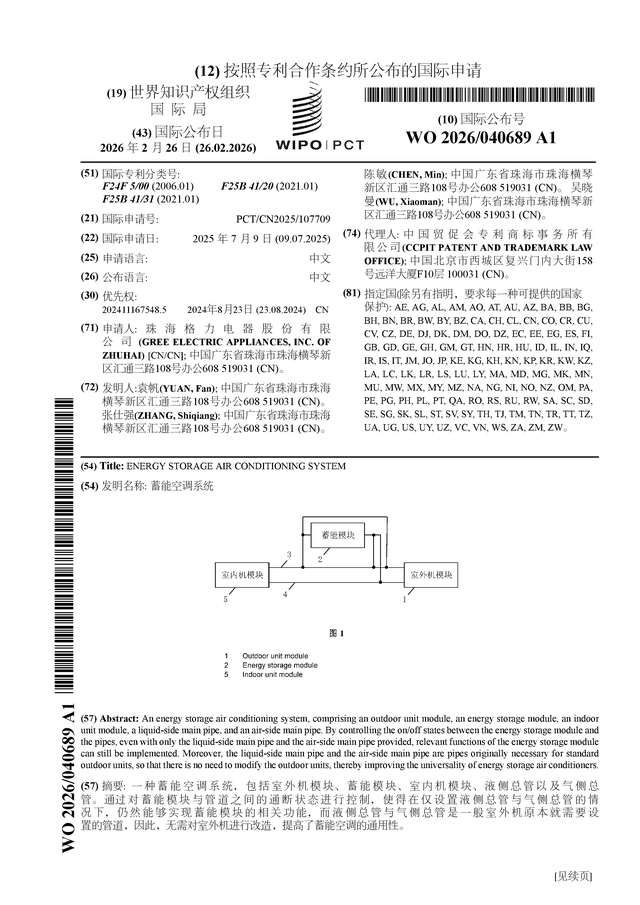 证券之星消息,根据企查查数据显示格力电器(000651)公布了一项国际专利申请,专利名为“蓄能空调系统”,专利申请号为PCT/CN2025/107709,国际公布日为2026年2月26日。