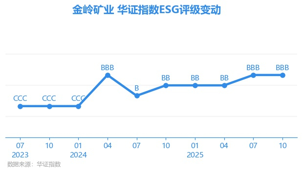 日前,华证指数公布了新一期(2025年10月31日)的ESG评级结果,金岭矿业(000655.SZ)获得BBB评级(华证指数评级为C起至AAA九档,C为最低档,AAA为其最高一级评级/AA为其第二档),上一期(2025年7月31日)ESG评级为BBB。本期ESG评级在206家金属与采矿行业A股上市公司中排名第89(上一期排名第86)。
