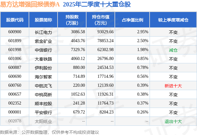 根据2025基金半年报公募基金重仓股数据,重仓该股的公募基金共7家,其中持有数量最多的公募基金为易方达基金的易方达增强回报债券A。易方达增强回报债券A目前规模为225.95亿元,最新净值1.401(10月20日),较上一交易日上涨0.0%,近一年上涨5.3%。该公募基金现任基金经理为王晓晨。王晓晨在任的基金产品包括:易方达投资级信用债债券A,管理时间为2013年9月10日至今,期间收益率为76.16%;易方达裕祥回报债券A,管理时间为2022年4月30日至今,期间收益率为18.48%;易方达安泽180天持有期债券A,管理时间为2024年1月24日至今,期间收益率为4.87%。