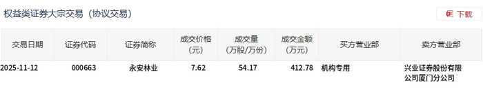 11月12日,永安林业大宗交易成交54.17万股,成交额412.78万元,占当日总成交额的2.37%,成交价7.62元,较市场收盘价7.71元折价1.17%。