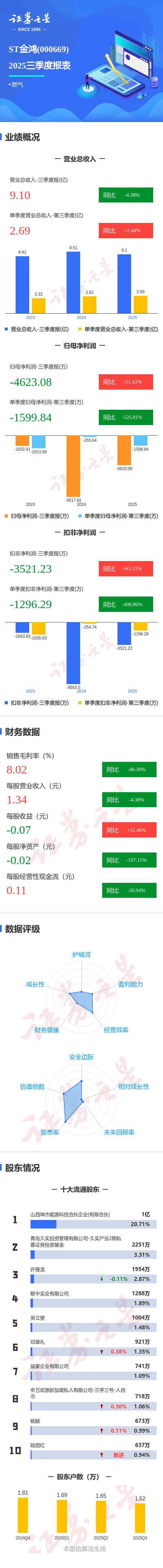 证券之星消息,ST金鸿2025年三季报显示,前三季度公司主营收入9.1亿元,同比下降4.38%;归母净利润-4623.08万元,同比上升51.43%;扣非净利润-3521.23万元,同比上升63.26%;其中2025年第三季度,公司单季度主营收入2.69亿元,同比上升2.45%;单季度归母净利润-1599.84万元,同比下降525.82%;单季度扣非净利润-1296.29万元,同比下降408.86%;负债率96.66%,投资收益463.36万元,财务费用3794.71万元,毛利率8.02%。