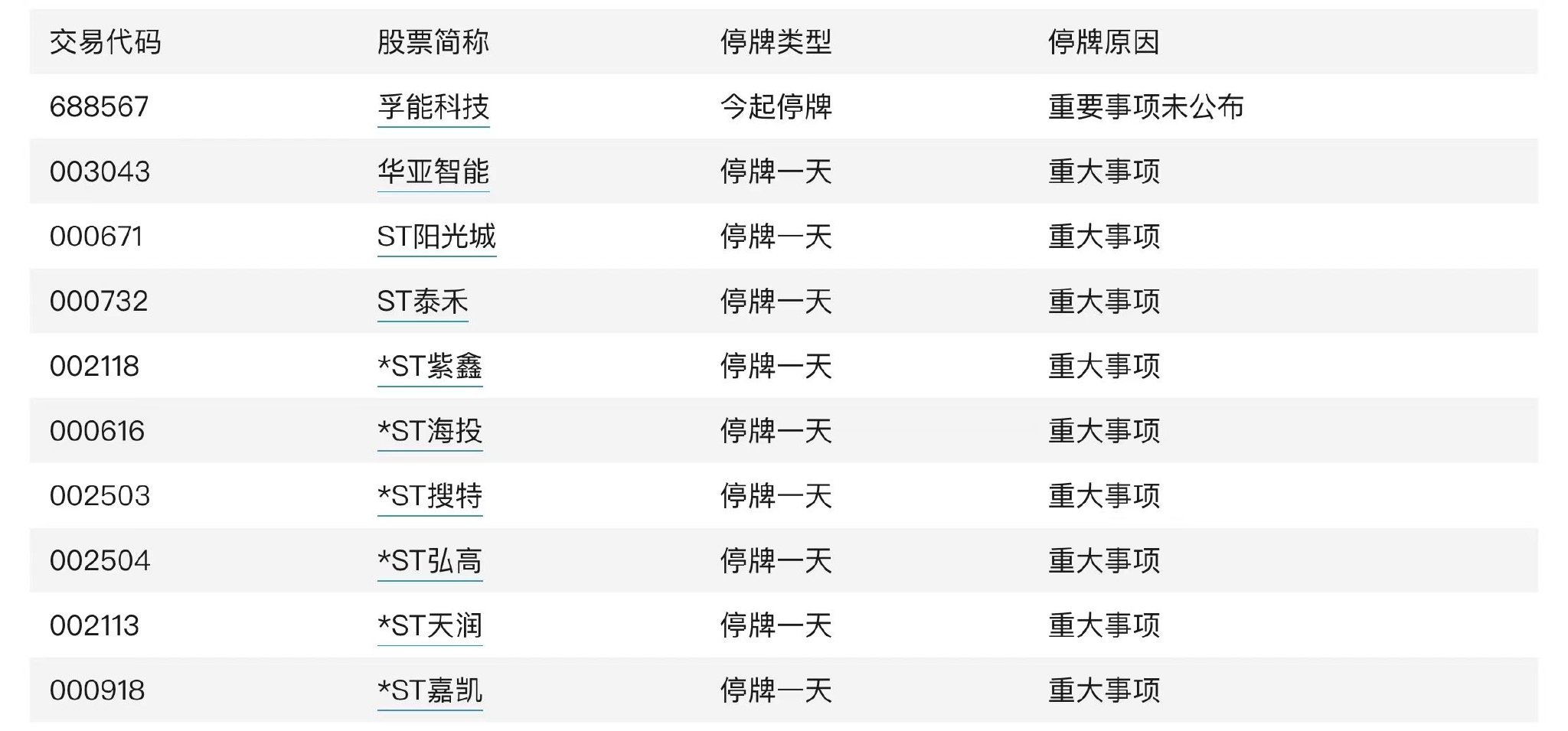 孚能科技、华亚智能、ST阳光城等10股今日停牌