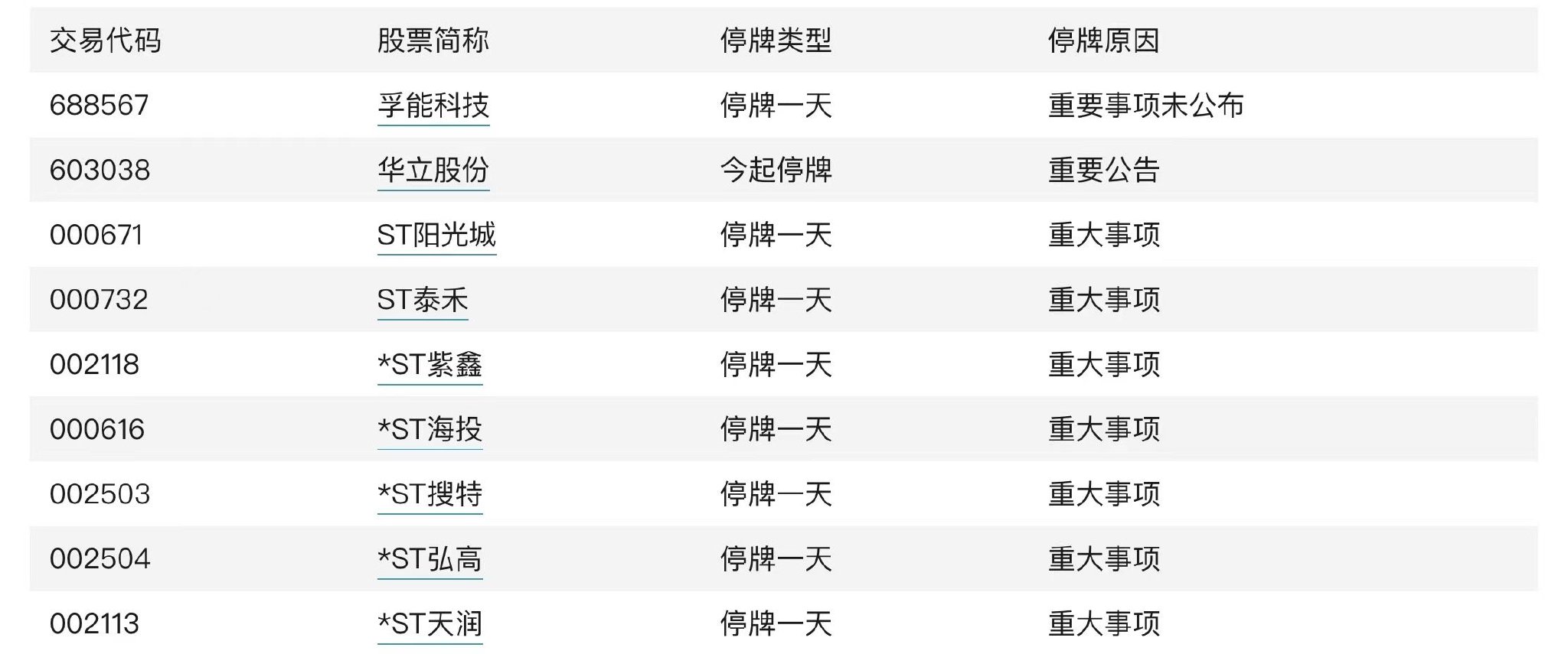 孚能科技、华立股份、ST阳光城等9股今日停牌