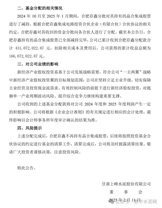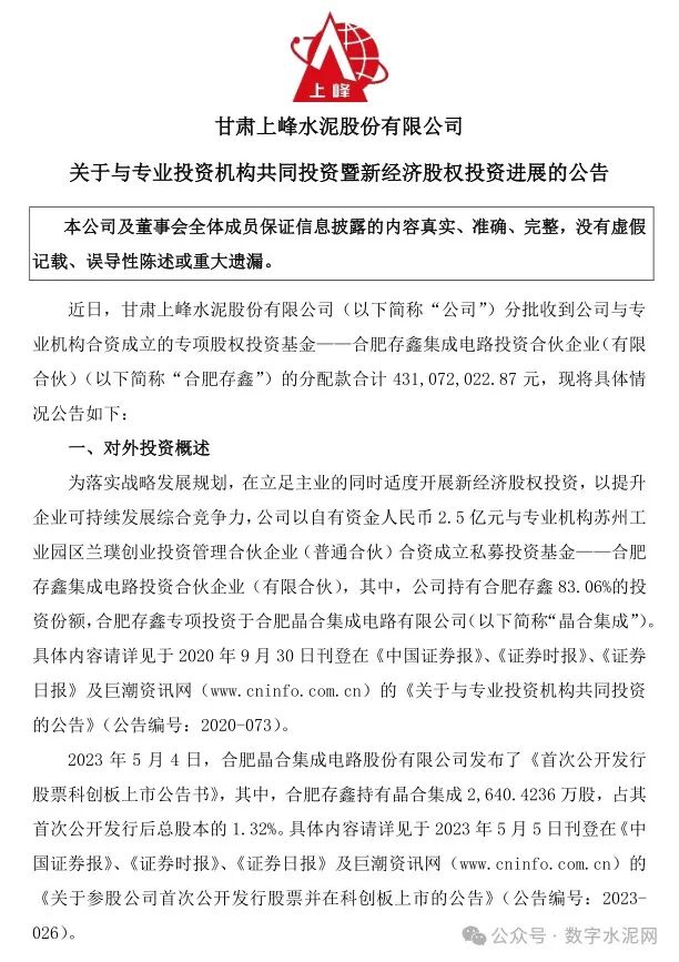 2月11日,上峰水泥发布《关于与专业投资机构共同投资暨新经济股权投资进展的公告》称,近日分批收到公司与专业机构合资成立的专项股权投资基金合肥存鑫集成电路投资合伙企业(有限合伙)的分配款合计4.31亿元。