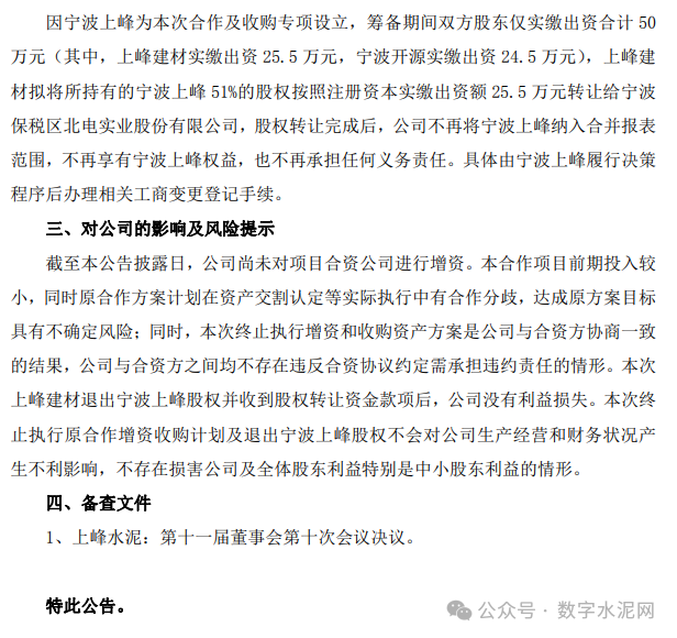 因宁波上峰为本次合作及收购专项设立,筹备期间双方股东仅实缴出资合计50万元(其中,上峰建材实缴出资25.5万元,宁波开源实缴出资24.5万元),上峰建材拟将所持有的宁波上峰51%的股权按照注册资本实缴出资额25.5万元转让给宁波保税区北电实业股份有限公司,股权转让完成后,公司不再将宁波上峰纳入合并报表范围,不再享有宁波上峰权益,也不再承担任何义务责任。具体由宁波上峰履行决策程序后办理相关工商变更登记手续。