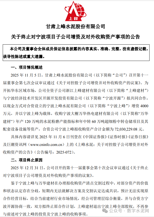 日前,上峰水泥发布《关于终止对宁波项目子公司增资及对外收购资产事项的公告》显示,公司召开的第十一届董事会第十次会议审议通过《关于终止对宁波项目子公司增资及对外收购资产事项的议案》。鉴于宁波上峰与万华建材在办理拟收购资产清点交割过程中,对部分资产的价值和状态认定存在分歧,短期内无法就解决方案及交割认定达成共识,预计无法实现原合作经营目标,结合当前建材行业市场情况,经公司管理层综合衡量,并与合资方宁波开源协商一致,双方拟终止原合作计划,上峰建材退出宁波上峰全部股权,不再参与前述对宁波上峰的投资及宁波上峰的收购事项。