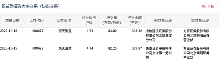 10月15日,恒天海龙大宗交易成交165.25万股,成交额783.29万元,占当日总成交额的7.08%,成交价4.74元,较市场收盘价5.3元折价10.57%。