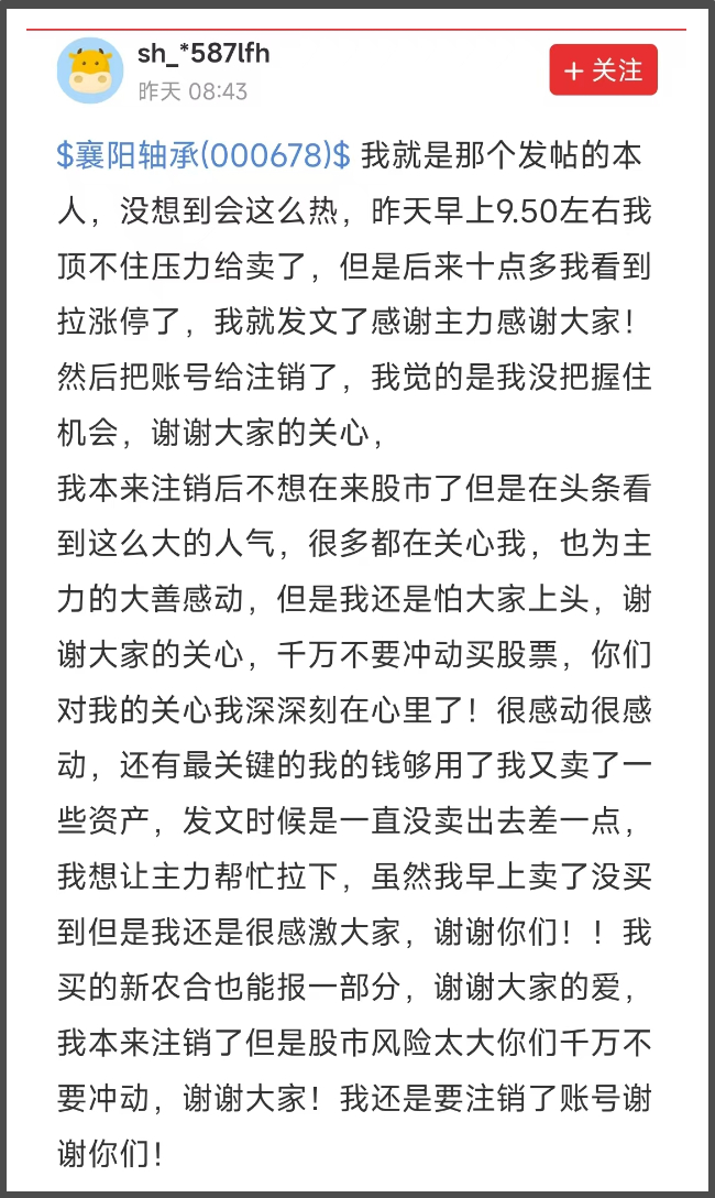 上周末,发声的股民再次回应,感谢股民的关心和拉涨停的主力,并呼吁大家不要上头,自己股票在涨停前已经卖掉,孩子看病钱已经凑够,自己已经注销账号,并提醒大家股市风险太大,千万不要冲动。