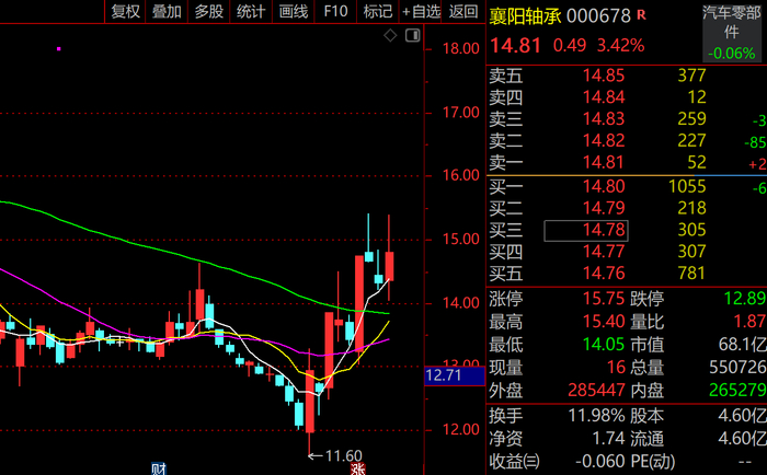 周三,近期热股襄阳轴承再现异动,据交易所数据显示,襄阳轴承开盘报14.36元,随后股价震荡下行至14.05元低点,10时13分左右开始快速拉升,最高触及15.40元,涨幅一度达到7.55%,目前报14.91元,上涨4.12%,成交额7.86亿元,换手率达11.60%。