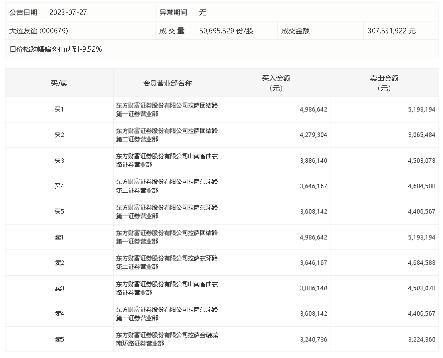 7月27日,大连友谊今日跌停,龙虎榜数据显示,上榜营业部席位全天成交4872.44万元,占当日总成交金额比例为15.84%。其中,买入金额为2364.71万元,卖出金额为2507.73万元,合计净卖出143.01万元。