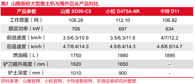 山推的超大型推土机在产品性能可与海外巨头产品比肩。以山推SD90-C5额定功率 708 kW、整机自重逾 106 t,核心硬指标与卡特 D11、小松D475A几乎肩并肩。山推通过自主研制大马力传动系统、采用负载敏感液压技术并配置智能显控终端,显著提升了作业效率与维护便利性,打破了外资品牌在超大型推土机领域的技术垄断。随着公司大马力产业化项目落地、海外服务网点加密,以及电动、无人驾驶等新技术加速商业化,山推大型推土机有望进一步提升全球竞争力,并在“一带一路”等增量市场获得更多高端份额。