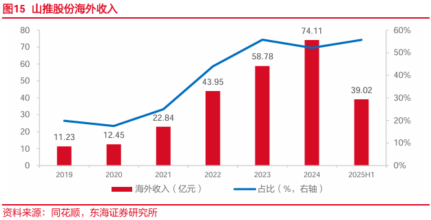 公司坚定全球化战略,海外收入持续增长。公司坚持将出口业务作为全公司的战略重心,根据公司公告,截至2025年上半年,公司销售网络遍布全球160多个国家和地区,包括154家海外经销商与超过520家海外营业网点,并设立了10家海外子公司,推动经销商由单一依靠推土机销售,向推土机、挖掘机、装载机等全产品系列销售转型。公司提速海外本地化布局,启动建立印尼、泰国、澳大利亚及尼日利亚四家海外子公司。2024年公司海外业务的收入达74.11亿元,收入占比达52.1%,海外业务增速与占比在国内同类型制造商中处于领先水平。