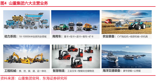 山重集团业务覆盖多领域。山重集团主营业务涵盖动力系统、商用车、工程机械、农业装备、智慧物流、海洋交通装备等六大板块。重型卡车、重型发动机、重型变速器销量全球第一,工业叉车、豪华游艇全球领先,农业装备、推土机等销量中国第一,能源电力系统销量全球前三,中速船舶动力销量全球前三。产品销往全球170多个国家和地区。