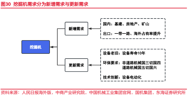 挖掘机销量主要由下游需求决定。挖掘机需求可分为两类新增需求和更新需求:国内的新增需求取决于下游地产、基建、矿山等固定资产投资;国外的新增需求取决于国内品牌海外市场占有率的提升、“一带一路”等国家基建项目和海外矿山开发等;更新需求主要包括设备老化自然更新需求,环保标准升级的换代需求和技术创新后的升级需求。