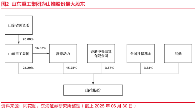 山东省国资委为实际控制人。山东重工集团、潍柴动力构成公司的控股股东,合共持有股份总数约占总股本40.07%。山东重工集团为最大控股股东,实际控制人为山东省国资委。截止2025年半年报,公司其他主要股东为香港中央结算公司和全国社保基金,分别持股3.57%和3.84%。