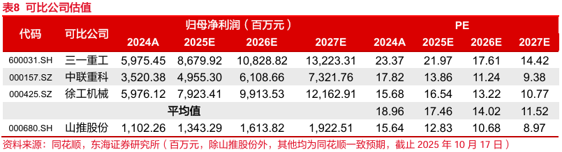 公司主营业务在工程机械领域,我们选取工程机械行业内的三一重工、中联重科和徐工机械作为可比公司,对应2025-2027年可比公司PE平均值为17.46/14.02/11.52。公司的全球化、电动化、智能化、无人化等战略持续推进,并在挖掘机和矿车领域积极布局,带动公司业绩持续成长。预计2025-2027年公司归母净利润分别为13.43/16.14/19.23亿元,当前股价对应PE分别为12.83/10.68/8.97倍,相对可比公司低。公司是国内推土机龙头,挖掘机业务有望通过现有推土机销售渠道实现放量。另外,公司背靠山重集团,协同效应明显,公司在行业内研发创新、产业规模、品牌效应、运营成本都有显著优势。首次覆盖给予“买入”评级。