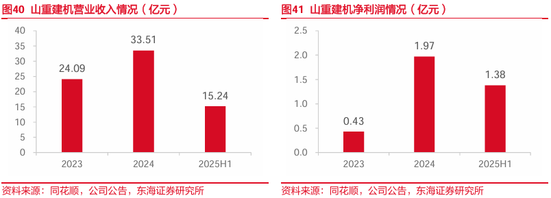 山重建机2024年净利润高增。山重建机2023年实现营业收入24.09亿元,归母净利润为0.43亿元;2024年度营收达33.51亿元,归母净利润增至1.97亿元,同比增长高达358.1%。山推股份收购山重建机股权后,迅速补齐挖掘机业务短板,推土机与挖掘机协同发展。借助集团黄金产业链,实现动力总成、液压件等核心资源共享,打造出新增长引擎。