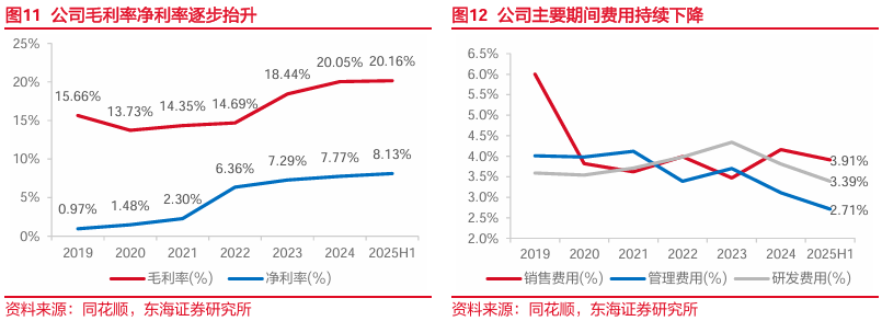 持续降本增效,主要费用下滑。2019-2025年上半年,公司期间费率稳中有降,管理费率降低至2.71%,处于较低水平;随着海外市场的开拓和产品展会发布宣传,销售费率小幅上升达3.91%;研发方面,截止2025年上半年,公司研发支出达2.37亿元,占营业收入比重达3.39%,费用率有所下滑,但研发投入绝对仍在增长。