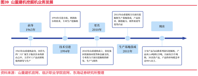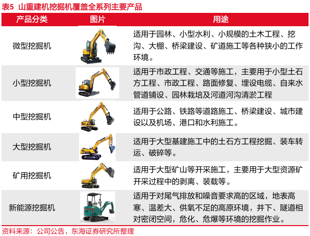 山重建机挖掘机产品系列覆盖齐全。近年来,山重建机根据市场需求,依托山东重工集团在研发、渠道、产业链等方面的协同优势和自身多年的技术经验积累,持续不断地升级产品。目前公司拥有临沂、济宁两个生产基地,具备2万台挖掘机的生产能力,形成1.2吨-125吨挖掘机整机产品序列,在电控系统设计、减震降噪、高效节能等技术方面处于行业领先水平。根据中国工程机械工业协会数据,山重建机2024年1-9月在挖掘机市场的占有率为4.03%,是国内主要的挖掘机制造商之一。