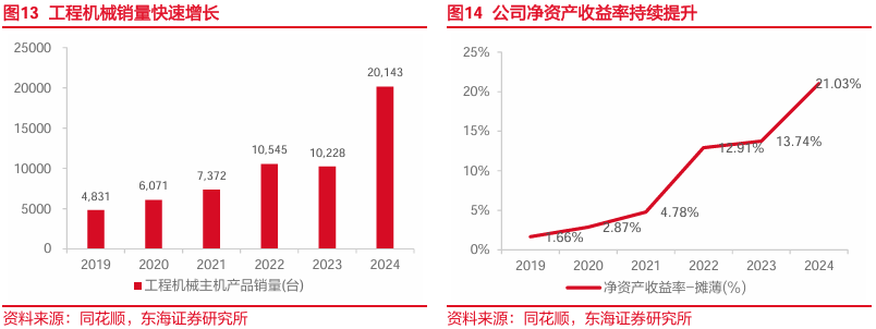 公司工程机械销量创新高。工程机械行业经济运行正逐步向好,其中,国内市场正在复苏,出口继续保持稳定增长。2024年公司全年整机销量20,143台,实现高增长。同时,2024年净资产收益率继续提升,高达21.03%,经营效益持续提升。