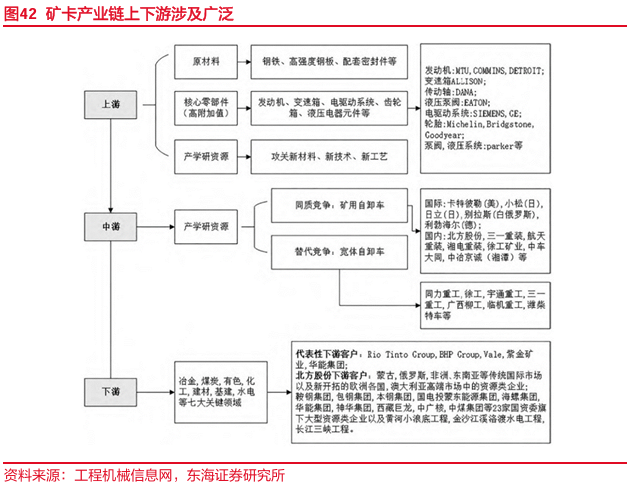 矿用刚性自卸车(俗称“刚性矿卡”)专为露天矿剥离岩土、承运矿石而设计,采用整体刚性车架,运距短、吨位大,通常由大型电铲或液压铲快速装载,在采掘面与卸载点之间高频往返。其运输效率与运营成本直接左右矿山产能,被视为露天开采的“咽喉”装备。下游领域需求中,矿产板块占绝对主力,能源领域分摊剩余需求。刚性矿卡上游涉及产业广泛,主要包含动力系统(发动机、传动系统、动力电池、电机等)、车体车架(车架、货箱、悬挂系统等)、电气和智能系统(线控底盘、智能驾驶系统、电源管理等)、关键易损件(轮胎、制动盘、液压缸密封圈、传动轴万向节等)等。