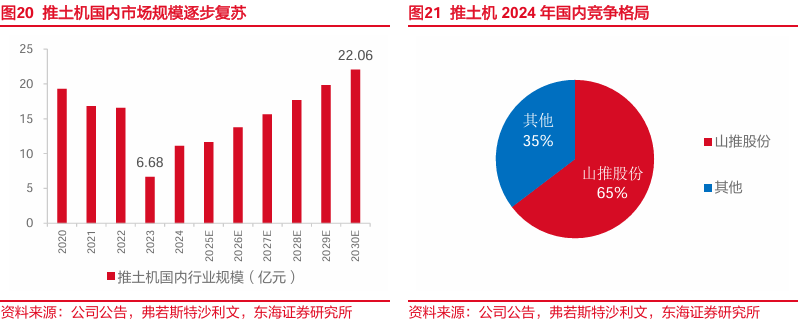 推土机全球规模达500亿,山推国内第一全球前三。推土机为铲土运输机械中最常应用设备,主要用于推土、平地、运输及采矿作业。全球推土机市场规模2024年达550.55亿元,根据弗若斯特沙利文预测2030年市场规模将增长到600.6亿元。2024年山推是全球第三大推土机制造商,全球市场份额达11.41%。推土机是山推的拳头产品,是国内最大的推土机制造商,占国内市场份额为64.7%。山推的超大型推土机在产品性能可与海外巨头产品比肩,实现业内首发纯电无人推土机。未来公司依托海外产能布局加速释放,预计2025年起大马力推土机出口将实现显著增量。另外,随着国内大规模设备更新政策的推进,加上大型基础设施水利和矿业投资稳定增长带动需求,国内销量或逐步回升。