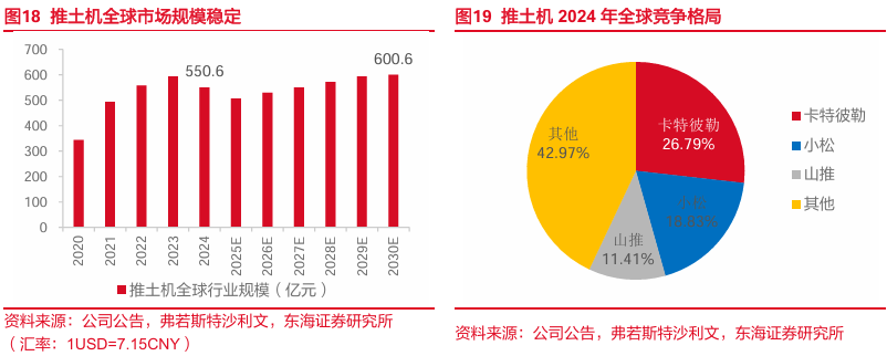 全球推土机市场规模稳定。推土机主要用于推土、平地、运输及采矿作业,广泛应用于采矿、水利工程、铁路建设、港口开发、农业和林业等多种场景。推土机市场的扩张主要受全球基础设施建设加速及全球采矿业增长的推动。在发展中国家快速城镇化、采矿活动增加、农业现代化、土地开发等应用的推动下,预计全球推土机市场将稳步扩张。弗若斯特沙利文预测,全球推土机市场规模将从2024年的550.55亿元增长至2030年将达600.6亿元,复合增长率为1.6%。