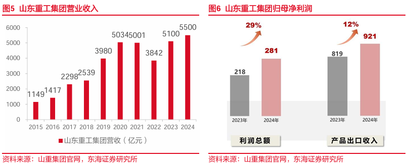 山重集团收入规模超5000亿元。2024年山东重工集团在复杂的内外部环境下,凭借科技自强、全球布局、产业链协同和卓越运营,实现收入5500亿元,以及利润281亿元,收入和利润双双增长。庞大的收入规模和持续的海外出口增长,奠定了其作为全球高端装备制造行业领导者的地位。