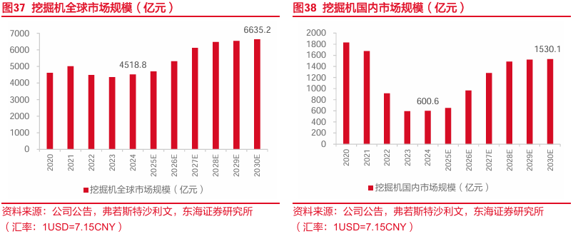 全球挖掘机市场规模庞大达5000亿元左右。挖掘机广泛应用于基础设施建设、采矿作业和城市建设,其市场的扩张主要受全球下游应用场景的持续扩张、新能源技术发展等因素驱动。2024年全球挖掘机市场规模达4518.8亿元。根据弗若斯特沙利文预测,挖掘机市场预计到2030年将达6635.2亿元,年复合增长率为6.6%。