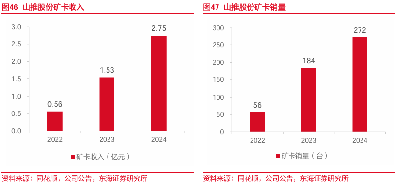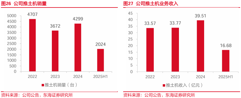 全力拓展矿卡业务,销量收入持续增长。公司凭借与山东重工的战略协同,成功掌控了发动机、变速箱及车桥等关键总成技术。公司矿卡产品谱系目前已完善,覆盖70-220吨全区间,并囊括燃油、混动与纯电多种动力形式,多款产品在市场验证中表现卓越。公司于2025年重磅发布了以TEH260刚性矿卡为代表的大型矿山产品,进一步强化了在矿山领域的战略布局与品牌影响力,展现出强劲的市场竞争力。2024年山推矿卡业务实现收入达2.75亿元,同比增长79.35%,另外实现矿卡销量272台,同比增长47.83%。