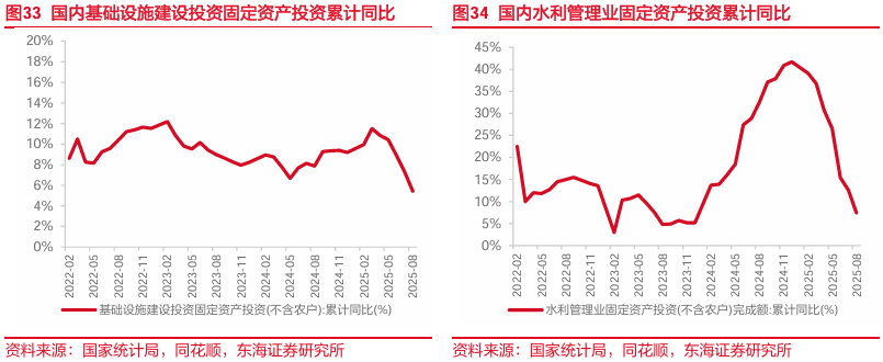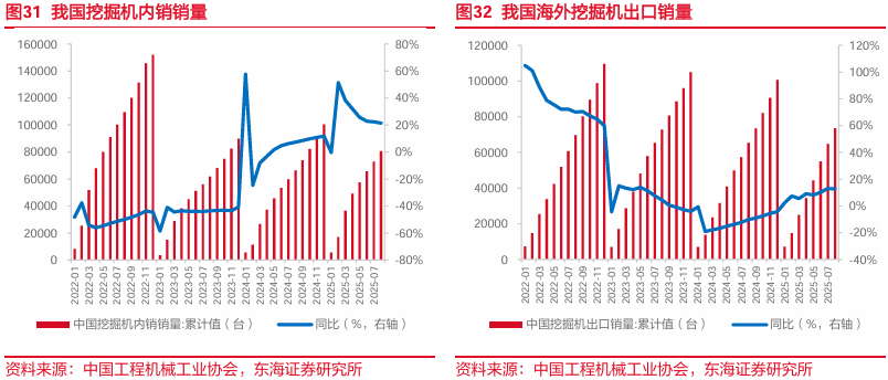 挖掘机内销复苏提速。根据国内销售数据,2025年1-8月国内挖掘机内销累计80,628台,同比增长21.50%,复苏态势强劲。从国内宏观数据看,根据国家统计局2025年8月全年国内基建固定投资同比增长5.42%;其中,水利管理业同比增长分别为7.40%,基建投资持续带动下游需求;国家持续推进城市更新、老旧小区整治行动,财政货币政策加码,“两重”“两新”投入加大带来刚性置换需求,以及有色矿山、重大水利工程、高标准农田项目的稳定支撑,将逐步落地释放需求红利,助力国内工程机械行业需求回升。