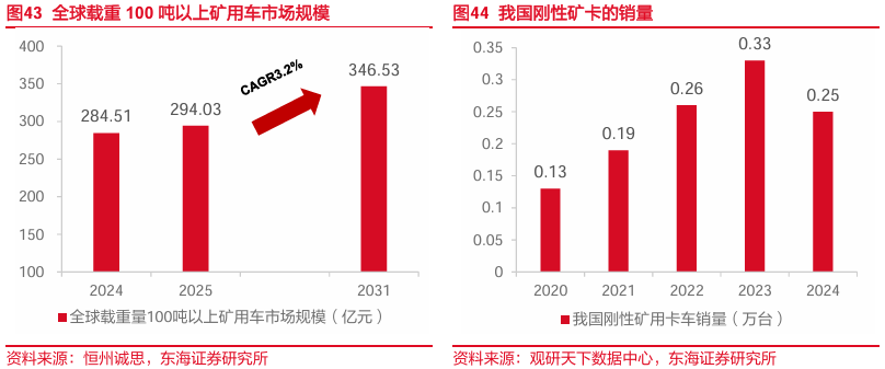 国内外刚性矿卡市场呈现稳定增长的发展态势。矿卡行业的稳定增长主要受到全球矿产资源需求持续增加、露天采矿比例提升以及矿山设备更新换代等多重因素的驱动。据恒州诚思调研统计,2024年全球载重量100吨以上矿用卡车收入规模约284.5亿元,到2031年收入规模将接近346.5亿元,2025-2031年CAGR为3.2%。从国内市场来看,我国矿用卡车需求以宽体矿卡为需求主体,刚性矿卡的需求相对而言较小,但是随着国内矿产开发的深化发展,大型的刚性矿卡将会逐渐被更多采纳,近年来也有着不错的市场表现,2024年大型刚性矿卡销量达0.25万台。
