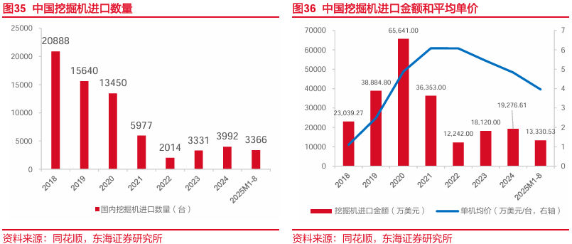 国产品牌已基本完成进口替代。由于近年国内制造业飞速发展,国产挖掘机厂商技术升级,综合竞争力已在国内得到认可,国产品牌已基本能满足国内需求。从挖掘机的进口数量来看,2018年挖掘机进口数量为20,888台,到2024年进口数量骤降仅为3,992台;从进口金额来看,进口金额2020年最高达6.56亿美元,2023年下滑至1.22亿美元;进口数量和金额在下滑,而平均单价也开始逐步下滑,表明进口的高端大型挖掘机正逐步被国产设备替代,国产设备的性能水平已逐步与海外巨头比肩。