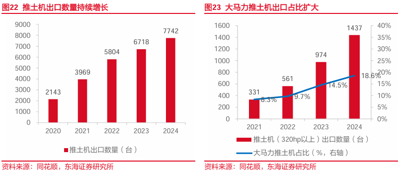 国内推土机出口呈持续增长态势。2024年推土机出口销量达7,742台,同比增长15.24%,实现持续增长态势。主要系“一带一路”沿线国家城镇化与基建投资加速,中亚、东南亚等地区对推土机需求旺盛,另外国产大马力推土机产品力的提升,使出口结构向高附加值方向优化,2024年320马力以上机型销量占比已升至18.6%。随着国内厂商海外渠道完善,以及中国对外矿业投资保持高增,推土机出口有望延续高景气,并在全球高端市场实现更大份额的突破。