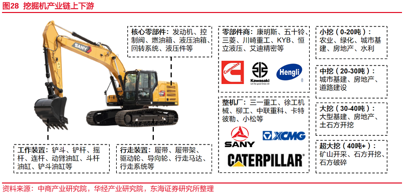 挖掘机下游主要有房地产开发、基础设施建设、采矿业、农业、水利等相关行业。挖掘机根据其吨位可分为超大挖、大挖、中挖、小挖。超大挖掘机特别适用于矿山开采和岩石破碎等高强度作业场景;中大型挖掘机则常见于城市基础设施建设、道路和桥梁工程等大型基建项目,其需求与整体的基础设施建设密切相关。相比之下,小型挖掘机则更适用于农业、园艺和小型土木工程等多样化的小型工程任务,因其灵活性和多功能性,应用范围更为广泛。