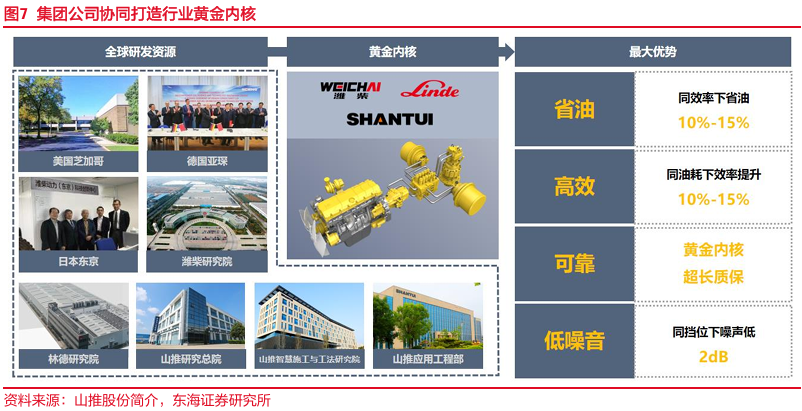 山推股份与集团子公司协同竞争力显现。凭借山东重工集团的产业链垂直一体化优势,山推股份在发动机、电控系统、液压系统、车桥、变速箱等关键领域与山东重工集团形成了紧密的全球研发与技术协同,同时配合山推行业领先的“山推双变”传动系统与“四轮一带”履带底盘件,真正实现了“发动机+电控系统+液压系统+传动系统+履带底盘系统”等零部件的自主可控。通过深度的技术融合与匹配,山推的工程机械主机产品可实现相同效率下省油15%,并形成了“智能、高效、省油、可靠”的显著差异化优势。