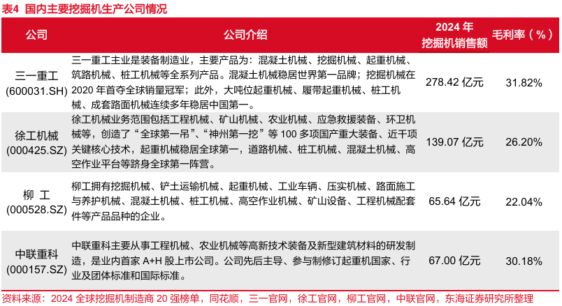国内挖掘机领域龙头为三一重工。目前国内有实力的主要挖掘机制造商有三一重工、徐工机械、柳工、中联重科、山河智能等;其中,三一重工在国内挖掘机市场处主导地位;从营业收入来看,2024年三一重工挖掘机销售收入第一,实现收入折合人民币达278.42亿元,毛利率为31.82%,领先国内其他公司。徐工机械作为国内老牌工程机械公司排名第二,挖掘机销售收入139.07亿元,毛利率为26.20%。国内企业与世界前三美日企业收入规模存在差距,未来有较大的进步空间。国内企业目前已占领国内大部分市场份额,正稳步推进全球化战略,未来将实现全球市场渗透率的进一步上升。