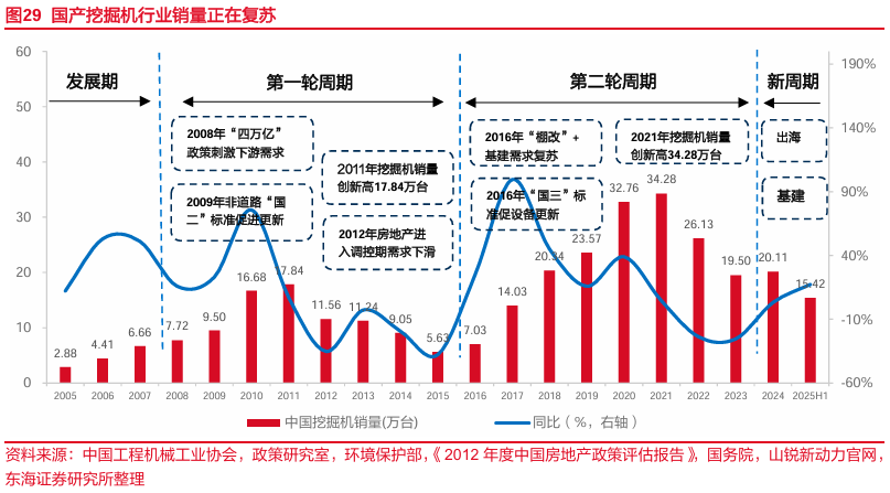 3) 2024年进入新周期销量开始复苏。2024年挖掘机销量20.11万台,同比增长3.1%。2025年上半年挖掘机实现销量15.42万台,同比增长17.20%,行业正在复苏。主要系国内伴随大规模设备更新和消费品以旧换新行动方案政策刺激出台,刺激老旧设备提前更新。同时,国内基建固定投资持续,大型水利工程项目持续稳定内需。另外,国产主机厂竞争力提升之下,海外出口销量占比大幅提升,海外新兴国家需求持续增长,高性价比和优质售后国产设备受到青睐,国产设备全球渗透率逐步提升。该周期国内龙头或成为世界巨头。