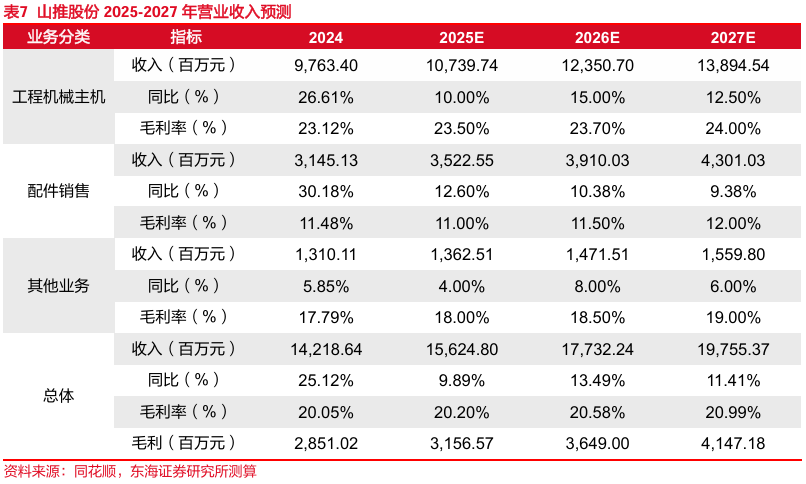 配件销售:根据公司历史数据,配件销售业务2024年增速达30.18%。未来随着客户产品保有量的上升,售后维护业务的增长,我们保守预计2025-2027年该业务增速分别为12.60%、10.38%、9.38%,毛利率预计分别为11.00%、11.50%、12.00%。