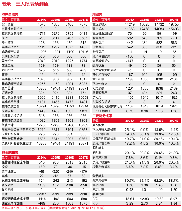 根据2025年上半年公司情况,公司管理效率稳步提升,持续降本增效,预计2025/2026/2027年管理费维持平稳状态,分别为3.10%/3.00%/2.95%;由于公司推动全球化力度加大,预计2025/2026/2027年销售费用分别为4.15%/4.00%/3.90%。研发费率预计随着规模效应逐步下降,但整体绝对值仍保持增长,预计2025/2026/2027年分别为3.75%/3.70%/3.65%;我们预计公司2025-2027年收入156.25、177.32、197.55亿元,收入增速分别为9.89%、13.49%、11.41%。2025-2027年公司的归母净利润分别为13.43、16.14、19.23亿元。