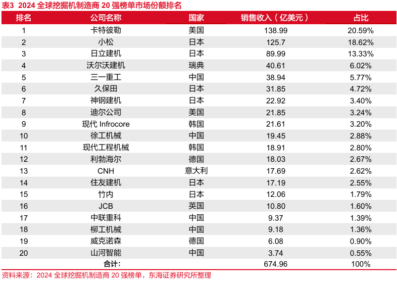 全球挖掘机领先者仍为卡特彼勒和小松。根据2024全球挖掘机制造商20强榜单,全球前20强制造商的挖掘机总销售额达到674.96亿美元,反映全球市场的庞大规模,折合人民币全球市场空间达4800亿元以上。卡特彼勒和小松分别位列榜单前两位,市场占比分别为20.59%和18.62%,在全球挖掘机市场稳居领导地位。榜单中有5家中国企业上榜,其中包括三一重工、徐工机械、中联重科、柳工和山河智能;三一重工排名世界第五,是最靠前的中国企业,其全球市场占比达5.77%,仍与前排巨头有一定差距。随着国内经济的稳步发展,庞大的国内市场培育出多个优质的制造商,中国挖掘机产业的综合实力全面提升,在全球市场逐渐扮演更重要的角色。